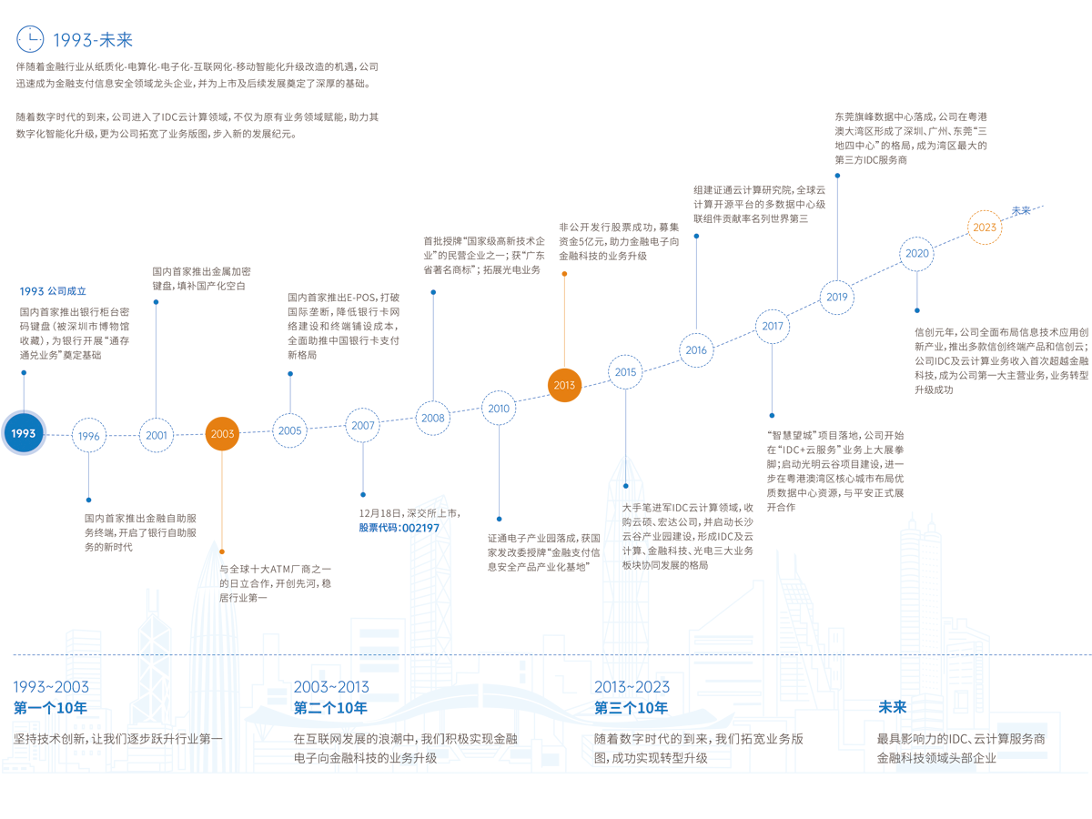 經過三十多年的發展,證通電子已經發展成爲涵蓋IDC及雲計算、金融科技、證開鴻OpenHarmony業務三大業務闆塊的高新技術企業。公司在深圳、長沙和東莞建設瞭(le)3座産業園,在深圳光明、廣州南沙、東莞石碣、東莞旗峰、長沙望城和武漢江夏共擁有6個大型互聯網數據中心,在深圳南山和光明、廣州、東莞、長沙和西安設立瞭(le)6個研發中心,在全國分布28個售後服務中心和182個售後服務網點。公司於(yú)2021年加入開放原子開源基金會,是開放原子開源基金會OpenHarmony項目群工作委員會委員單位、金融支付專委會副會長單位、油氣專委會副會長單位。2024年以子公司證開鴻運營鴻蒙業務,以“1+N”戰略,深耕金融,賦能醫療、能源、物業等多領域,積極推動開源項目發展,助力産業數智化創新轉型。公司建設瞭(le)高水平的智慧城市基礎設施平台和先進的物聯網智慧終端感知網絡,爲客戶提供“雲+網+端”全方位綜合解決方案,打造以互聯網爲基礎平台、以雲計算爲核心技術、以金融科技及智慧終端爲支撐的雲運營商的服務商和金融科技服務商,公司依托於(yú)六大數據中心的資源,與平安、華爲、百度、騰訊、阿裏等知名企業生态圈展開戰略合作,爲政府提供!DC+智慧城市的産品及服務;爲國有各大型銀行、股份制商業銀行和各中小商業銀行提供包括終端、業務軟件、平台運營和機房托管等類型多樣的差異化金融支付解決方案,産品足迹遍布全球160餘個國家和地區。