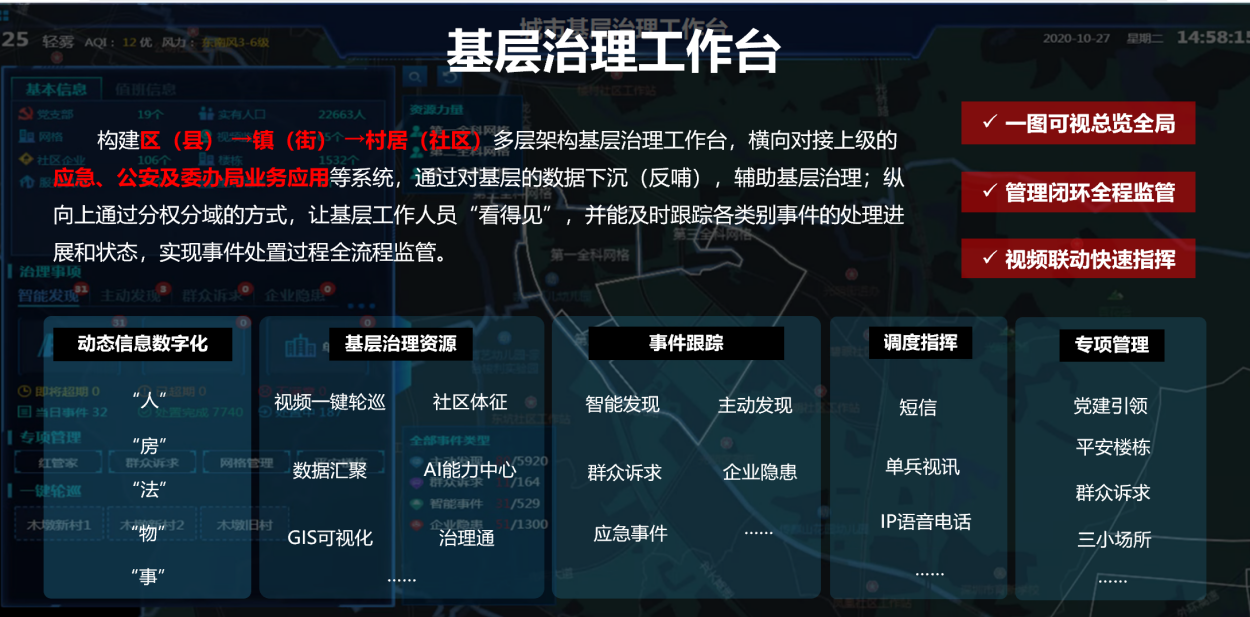 爲貫(guàn)徹(chè)習總書記“把更多更好的資源、服務、管理下沉到社區”的基層(céng)治理指導方針,充分利用智慧城市已建基礎設施,通過整合資源、數據共享爲基層(céng)治理管理人員、網格員、平安員等提供日常信息化管理工具。聚焦治安、治理、服務三大領域,通過數據下沉、全事件跟蹤、資源力量實時調度等手段,用數據把人、制度、服務、管理要求連接起來,真正支撐(chēng)基層(céng)的管理工作,實現精細化治理和精準服務,全面提升社區的治理與服務現代化水平。