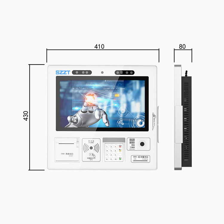 壁挂系列-ZT2830-I系列,15.6寸輕薄觸(chù)屏、鋼化玻璃面闆搭配環繞式鋁合金包邊(biān),輕量化設計、質感十足。機身小巧輕便,對空間利用率高,壁挂使用,安全穩固。标配面闆式憑條打印機,永不卡紙,使用維護便捷高效。