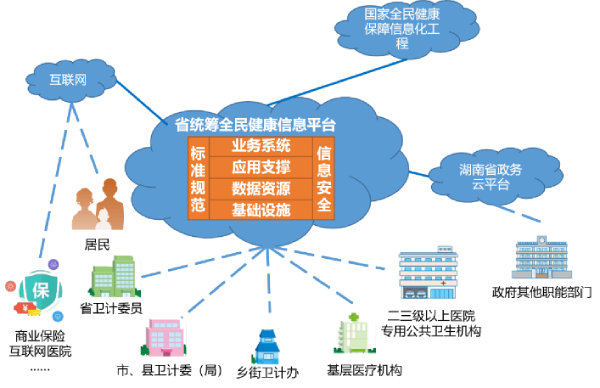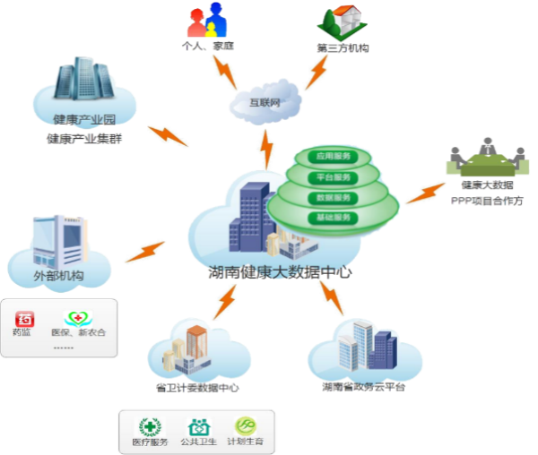 湖南健康大數據中心建設,一方面通過政策配套支持,與湖南省衛生健康委省級數據中心、湖南省政務雲平台以及相關外部單(dān)位對接,在政策許可、授權監管下,使用現有信息化成果與醫療衛生服務資源;另一方面,通過引入具有豐富經驗的醫療健康項目合作單(dān)位,基於(yú)健康大數據雲平台,建設“醫療健康+互聯網”應用,並(bìng)面向個人、家庭、第三方機構開展運營工作,開展健康大數據應用,培育醫療健康服務産(chǎn)業。
