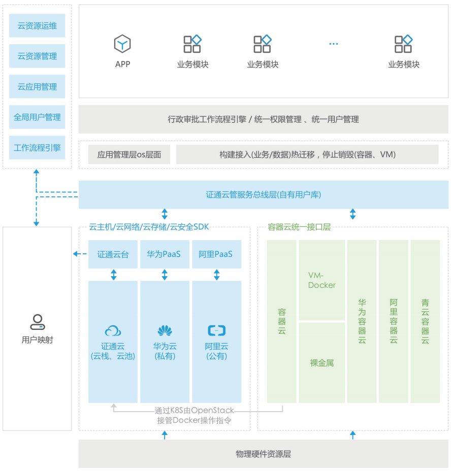 證通多雲/混合雲平台支持從(cóng)裸金屬服務器開始實現資源池快速構建,集成管理各大雲的平台。通過一體化的管理平台對資源池軟硬件等資源進行統一地監控、配置、部署和調度,以及進行雲服務管理相适應的流程和權限管理等,爲企業數據中心的雲計算基礎(chǔ)架構虛拟化與雲業務運營提供解決方案。
