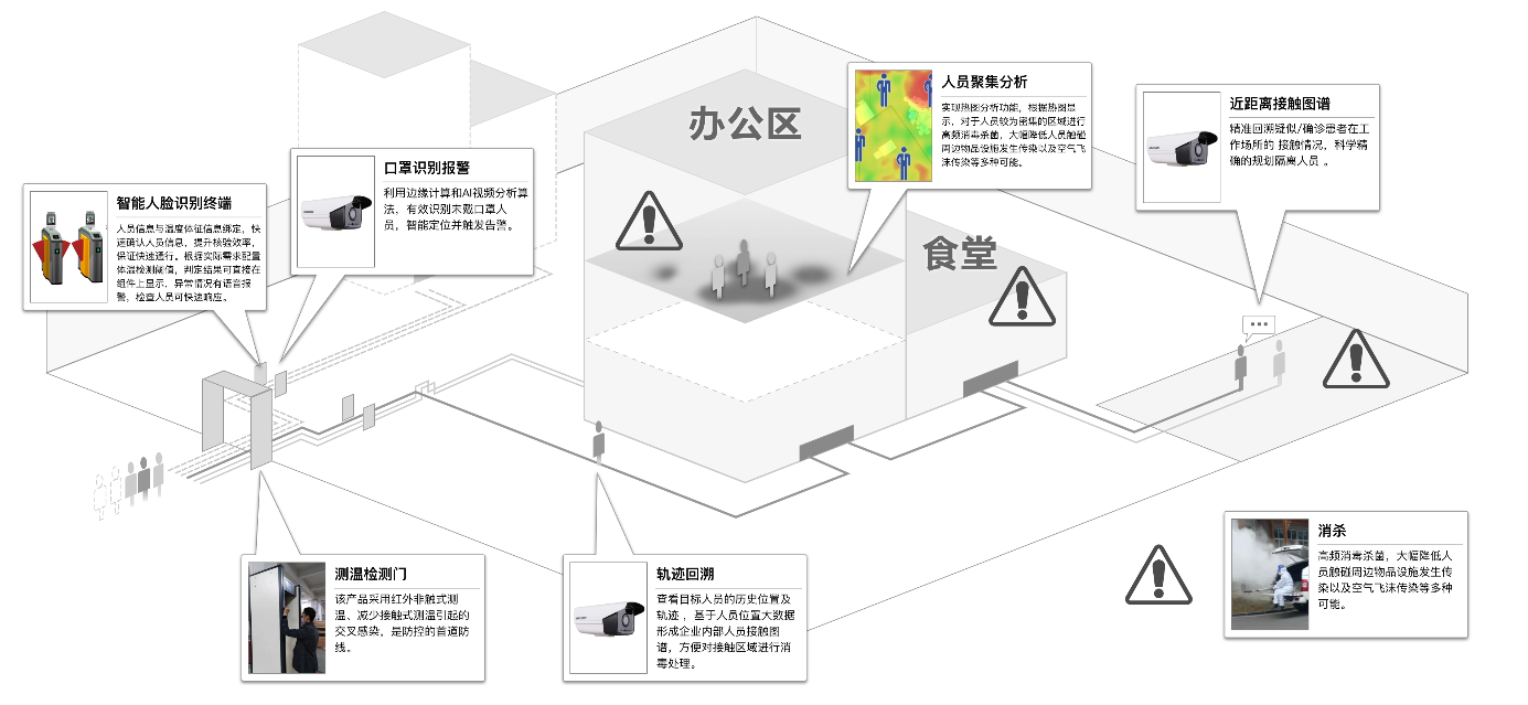 “園區防控解決方案”全稱“智慧園區緊(jǐn)急公共事件預警防控終端産(chǎn)品及雲服務解決方案”,是從線上健康打卡、非接觸AI人體溫度檢(jiǎn)測(cè)、人臉識别、口罩識别、物聯網終端的數據採(cǎi)集彙聚、“風險人員”活動軌迹和接觸(chù)回溯、近距離接觸(chù)預警、人員密集區域熱圖、重點(diǎn)區域高頻消殺、結合新冠肺炎確(què)診識别知識庫,結合智慧園區的門禁管理、視頻監控、運動軌迹識别,打造複工後的廠(chǎng)區(園區)全自動(dòng)、全區域、全天候、全目标覆蓋(gài)的主動(dòng)式疫情智慧園區預警防控平台,爲園區安全複(fù)産(chǎn)複(fù)工保駕護航。