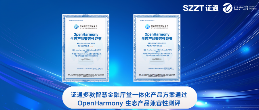 在金融科技快速發展與國産化替代加速推進的當下,技術創新與系統安全成爲金融行業關注的焦點。近日,深圳市證通電子股份有限公司(以下簡稱“證通”)迎來重大喜訊,其綜合櫃面終端、大堂式自助服務終端等多款智慧金融廳堂一體化産品方案,成功通過 OpenHarmony 5.0.2 版本的兼容性測評,並(bìng)獲頒OpenHarmony生态産品兼容性證書。這一成果不僅彰顯瞭(le)證通在金融科技領域的深厚技術實力,更爲金融行業的數字化轉型注入瞭(le)新的活力。